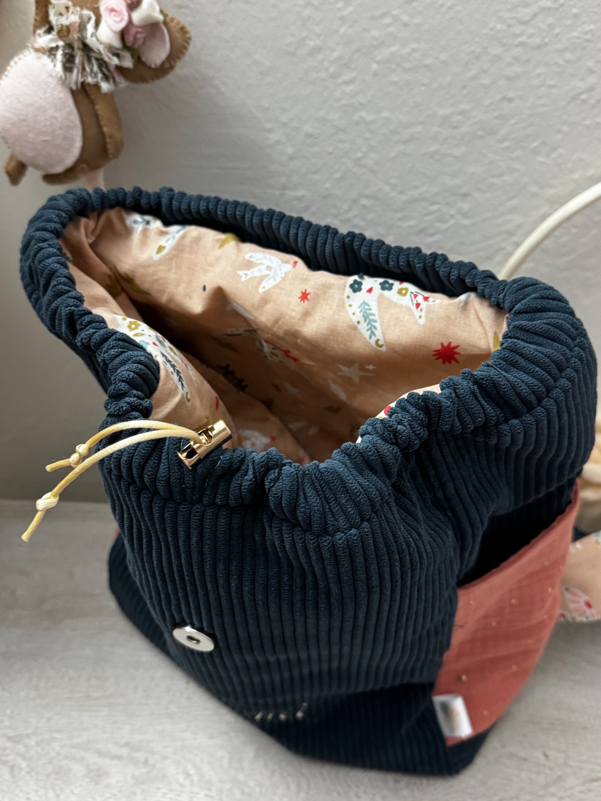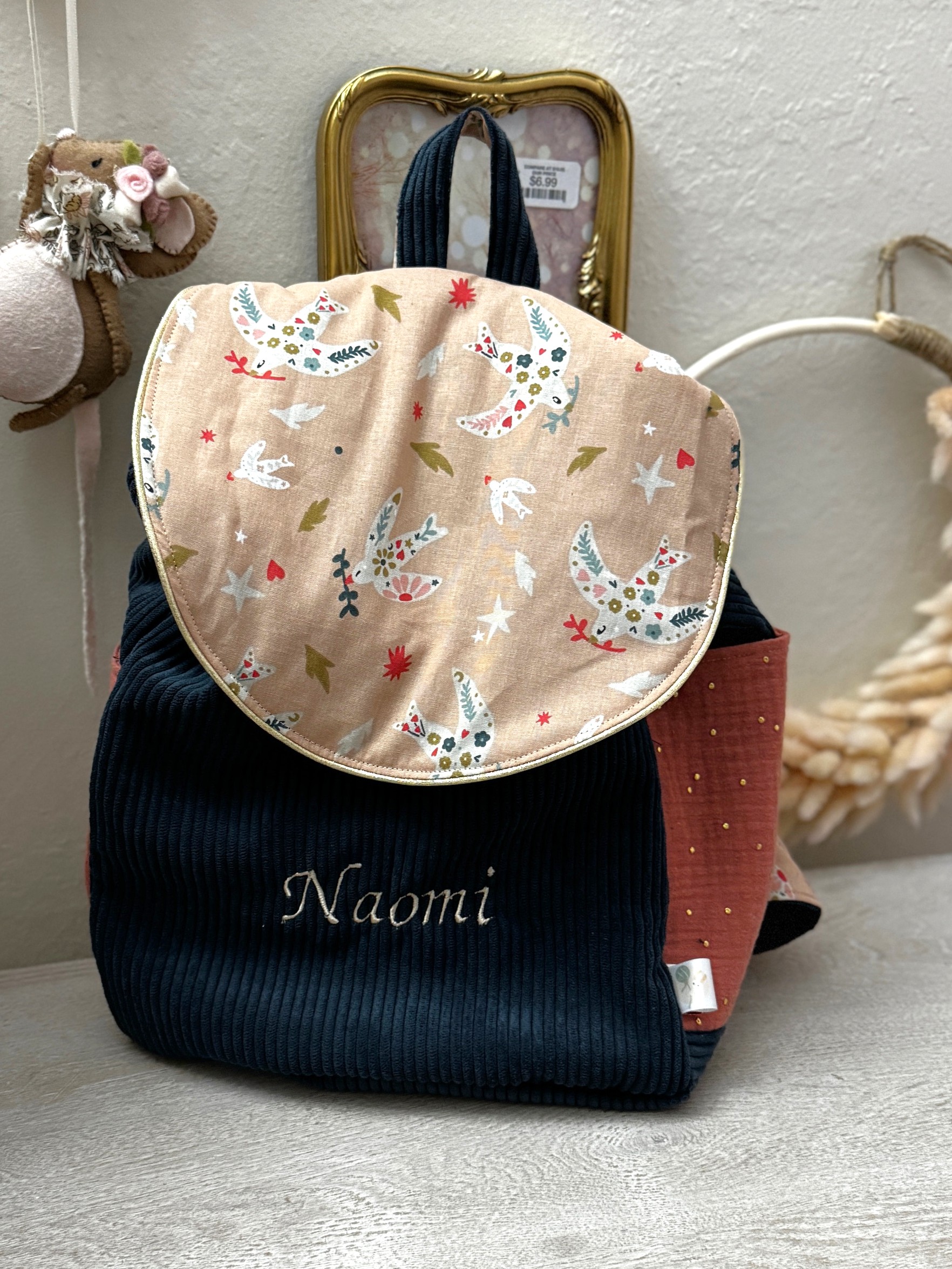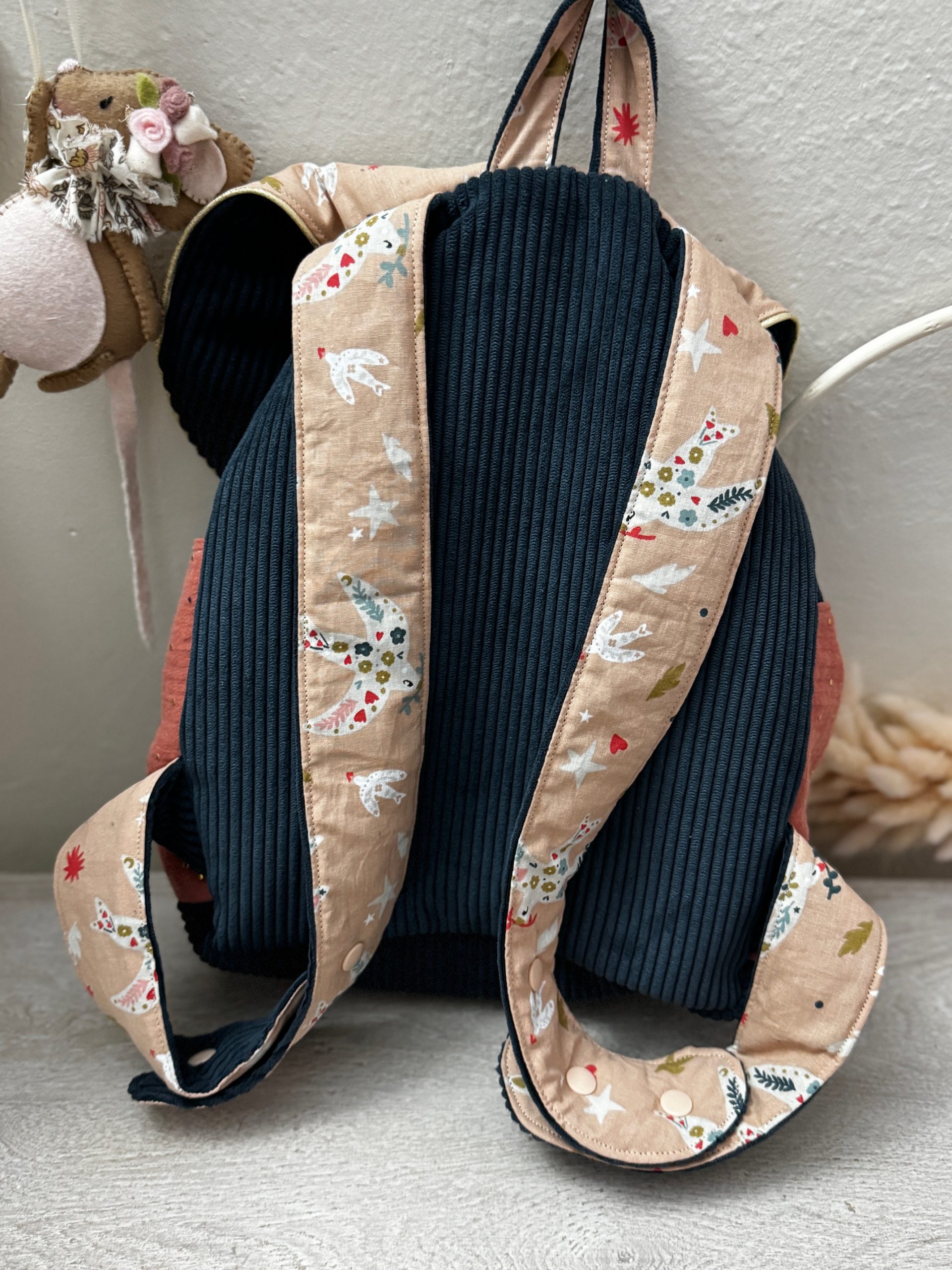Adorable backpack for little ones. Perfect for carrying a “doudou” blanket, photo album, water bottle, and extra clothes. It closes with a drawstring and the padded shoulder straps are adjustable to suit the child’s age.